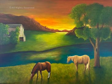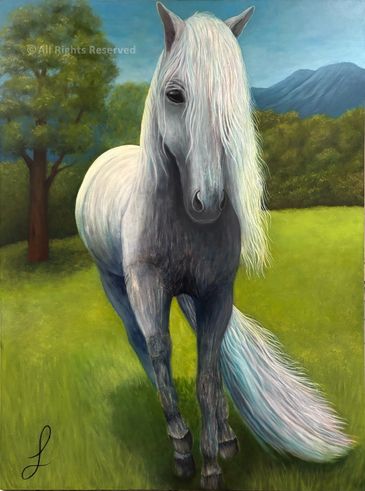 Have you ever had the experience of being in the presence of a horse and feeling an intense sense of serenity wash over you, compelling you to lean into them as all else fades away? It brings to mind a quote often attributed to Winston Churchill. "There is something about the outside of a horse that is good for the inside of a man". I feel this every time I’m with my horses and in fact many years ago while suffering from grief it was a horse that convinced me to start living again. Acrylic 22x28 canvas framed.