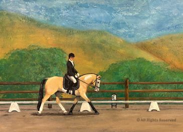 This is my first painting combining a person, and horse in a landscape setting 🎨 those that know me personally most likely expected a cow horse or cutter first however my first experience with horses was English Pleasure while growing up on the East Coast. So about 15 years ago when my friend Angie thought my two paint mares would do well in dressage I was excited. Angie trained both young mares and showed them beautifully in Tehachapi.