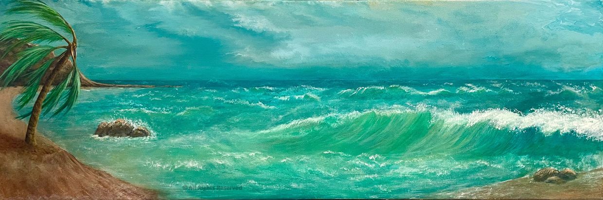 Inspired by the hues of turquoise and the raw power of the waves, this seascape contrasts a vivid sea against a moody, ominous sky. 1ft by 3ft gallery wrapped canvas